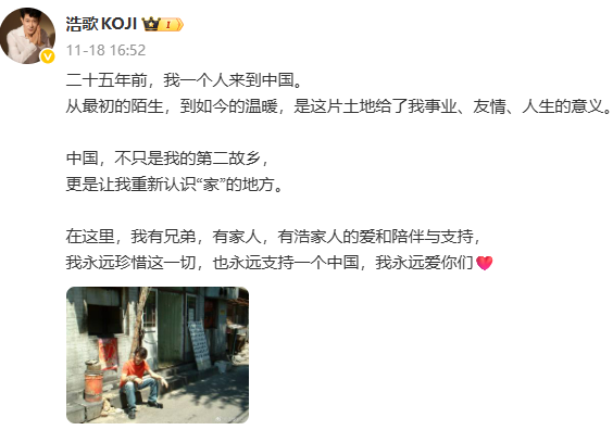 对此,矢野浩二表示,11月18日发的微博并不是出于什么“立场”或“表态”的考虑,而是一种很自然、很真实的心境。“我在中国生活、工作了25年,这里有我的家人和朋友,我对这里的一切都非常熟悉和喜爱,那条微博也只是有感而发。‘永远支持一个中国’是我发自肺腑的心里话。”