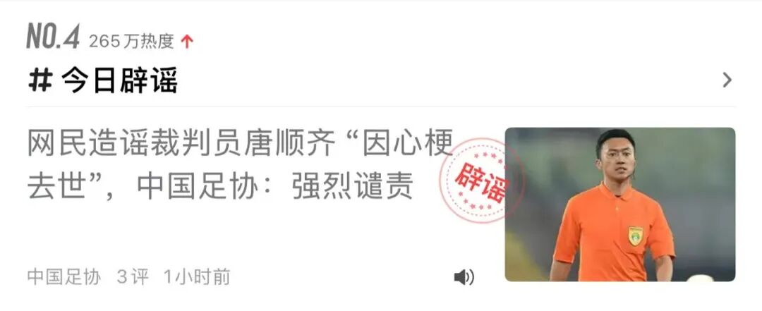 网民造谣裁判员唐顺齐“因心梗去世”,中国足协:强烈谴责